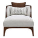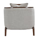 AICO Furniture Houston Chaise Pebble in Walnut 9095842-PBL-416. Unwind in style with the Houston Chaise, a luxurious addition to your living space. Upholstered in a mingled boucle fabric with soft hues of gray, ivory, and tan, this chaise blends understated elegance with modern comfort. The sculptural wood frame, finished in rich walnut with painted gold accents, adds a sophisticated contrast. A reversible feather-filled pillow provides a versatile touch to suit your aesthetic.