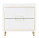 AICO Furniture Palm Gate Nightstand in Cloud White 9086040-108. Our Palm Gate Nightstand blends functionality and elegance. With gold accents, thoughtfully placed handles, and two velvet-lined drawers housed within a pristine acrylic body, it's a stylish addition to any bedside.