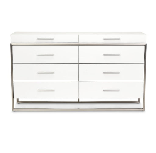 The epitome of fashion-forward design, this dresser is a beautiful blend of style and luxury. Shiny chrome-tone accents, a pearlized finish and mos...
