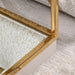 AICO Furniture Savannah Breeze End Table in Bright Gold LFR-SBRZ202-806. The Savannah Breeze End Table adds refined style and versatility to your living space. The table features a beveled glass top, offering a polished, elegant surface. A mirrored bottom shelf provides both functionality and a touch of glamour, perfect for displaying decor or keeping essentials close at hand.