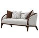 AICO Furniture Houston Loveseat Pebble in Walnut 9095825-PBL-416. The Houston Loveseat blends refined elegance with modern comfort. Upholstered in a mingled boucle fabric featuring soft hues of gray, ivory, and tan, this piece offers a sophisticated yet inviting aesthetic. Its walnut-finished wood frame is accented with painted gold details, adding a subtle touch of glamour. Designed for both style and relaxation, the loveseat includes a thoughtfully curated selection of feather-filled pillows in varied textures and tones, completing its luxurious appeal.