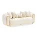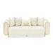 AICO Furniture Sassani Loveseat Crepe in Gold LFR-SSNI825-CPE-806. The Sassani Loveseat offers an intimate yet elegant seating experience. Upholstered in plush jacquard chenille and adorned with soft woven jacquard pillows, it brings a touch of refinement and warmth to any space. Gold accents and slender legs provide a sleek contrast, making this loveseat both a stylish and inviting addition to your living area.