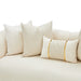 - 5 accent pillows included which are made from high-sheen yarn and a center pillow with gold metallic trim.