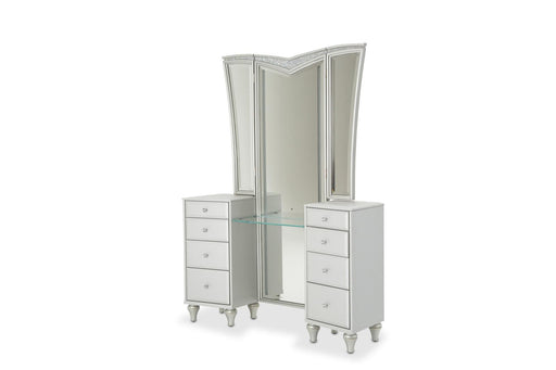 Melrose Plaza Collection by AICO Furniture Dove finish Top of most items is adorned with a mesh strip of crystallized facets