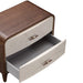 AICO Furniture Houston Large Nightstand in Walnut 9095042-416. The Houston Nightstand blends contemporary sophistication with effortless functionality. Framed in a rich walnut finish, its sleek silhouette is softened by rounded corners, while the textured gray drawer fronts feature a refined starburst pattern accented with gold trim. Two velvet-lined drawers with soft-close glides offer ample space for bedside essentials, while the spacious top provides the perfect surface for a lamp or decorative accents.