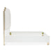 AICO Furniture Palm Gate King Upholstered Platform Bed in Cloud White. Bask in Palm Gate's bed, where luxury and comfort intertwine. Its unique headboard, with gold colored alloy framing, chic channeled upholstery, and a glossy acrylic bed frame and golden legs, create a timeless sleep sanctuary. Beyond its beauty lies convenience – USB 3.0 Ports are on each side of the bed.