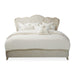 - Headboard features vertical channel tufting and a curving frame