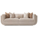 AICO Furniture Savannah Breeze Standard Sofa Cashmere in Bright Gold LFR-SBRZ815-CSM-806. Draped in a sumptuous jacquard chenille, the Savannah Breeze Sofa offers a sensory experience that's as indulgent as it is inviting. The five accent pillows, including an elegant animal pattern and a jewelry-adorned oblong centerpiece, bring a touch of fashion-forward allure to your living space. With its signature gold embellishments, this sofa offers a luxurious presence that effortlessly balances sophistication and coziness.