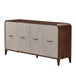 AICO Furniture Houston Sideboard in Walnut 9095007SA-416. The Houston Sideboard blends contemporary elegance with versatile storage. Framed in a rich walnut finish, its contrasting gray door fronts showcase a delicate starburst pattern with a subtly textured surface. A refined gold trim outlines the piece, enhancing its sophisticated silhouette. The sleek, tapered handles combine wood and metal for a modern, tailored touch. With ample storage and thoughtful details, this sideboard brings both function and style to any dining or living space.