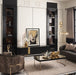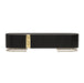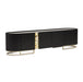 AICO Furniture Lisbon Media Cabinet in Silken Matte Black LFR-LSBN081-826. Introduce an air of sophistication to your entertainment space with our Lisbon Media Cabinet. Designed with a channeled front and finished in a silky matte black, this exquisite piece exudes elegance and style. The gold accent adds a touch of opulence, perfectly complemented by the gold legs and captivating mirrored top inlay. With four doors offering ample internal storage, this luxurious media cabinet seamlessly combines functionality, design, and refinement.