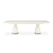 AICO Furniture Lisbon Double Pedestal Dining Table in Silken Matte Cream LFR-LSBN002-140. The Lisbon Dining Collection brings modern sophistication and a unique artistic touch to your dining space. Finished in a lustrous matte cream lacquer, this table embodies refined luxury. The tabletop showcases an abstract, untamed inlay, adding a layer of visual intrigue. Supported by bold pedestal bases with gleaming brass plated accents, the Lisbon dining table transforms every meal into a memorable occasion.